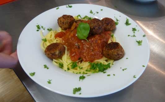 Dann gab es einen gemischten Salat mit einem tollen Dressing, das super easy zu machen ist und sehr lecker schmeckt. Als Hauptspeise haben wir Spaghetti gemacht – die hat auch jeder Zuhause – mit Tomatensauce und Bean-Balls aus Kidneybohnen und Haferflocken. Als Dessert gab es Schokoladenmousse aus Sojasahne. Wo man Sojasahne bekommt und auch auf was man achten sollte, habe ich erzählt. Ich hatte allerdings auch eine Schokomousse aus Avocado vorbereitet, weil viele Leute Soja nicht mögen oder nicht essen möchten.